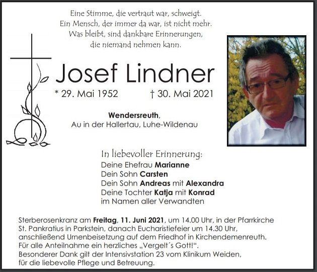 Traueranzeige Josef Lindner, Wendersreuth 09. Juni 2021, 04:00 Uhr Von: redaktion Traueranzeige Josef Lindner, Wendersreuth Landkreis Neustadt/WN Luhe-Wildenau