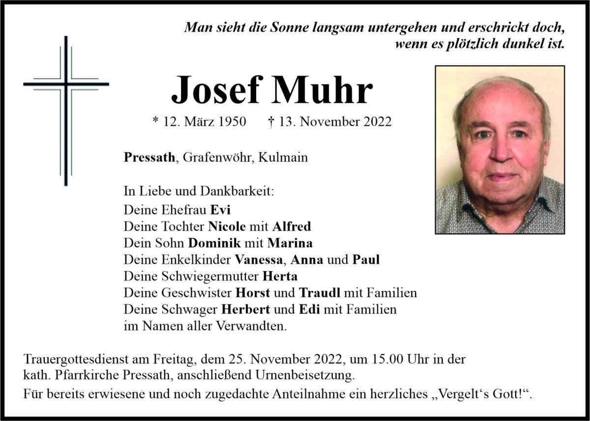 Traueranzeige Josef Muhr, Pressath 23. November 2022, 06:00 Uhr Von: redaktion Traueranzeige Josef Muhr, Pressath Landkreis Neustadt/WN Grafenwöhr Pressath Landkreis Tirschenreuth Kulmain