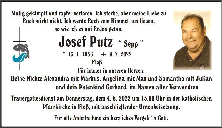 Traueranzeige Josef Putz, Floß 30. Juli 2022, 06:00 Uhr Von: redaktion Traueranzeige Josef Putz, Floß Landkreis Neustadt/WN Floß