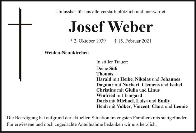 Traueranzeige Josef Weber, Weiden 20. Februar 2021, 06:16 Uhr Von: redaktion Traueranzeige Josef Weber, Weiden Stadtgebiete Weiden Neunkirchen Weiden Stadt