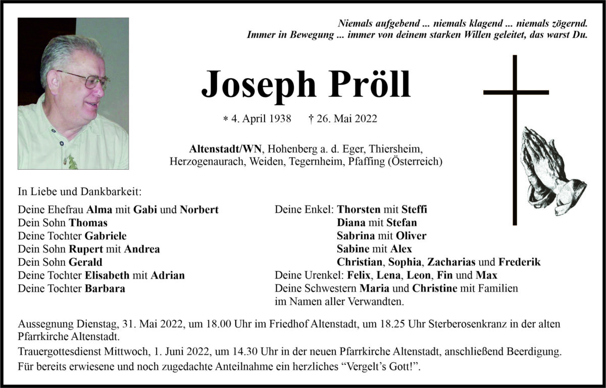 Traueranzeige Joseph Pröll, Altenstadt/WN 28. Mai 2022, 06:00 Uhr Von: redaktion Traueranzeige Joseph Pröll, Altenstadt/WN Landkreis Neustadt/WN Altenstadt/WN Stadtgebiete Weiden Weiden Stadt