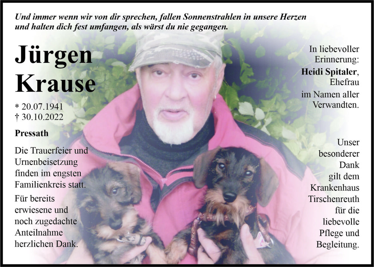 Traueranzeige Jürgen Krause, Pressath 04. November 2022, 06:00 Uhr Von: redaktion Traueranzeige Jürgen Krause, Pressath Landkreis Neustadt/WN Pressath