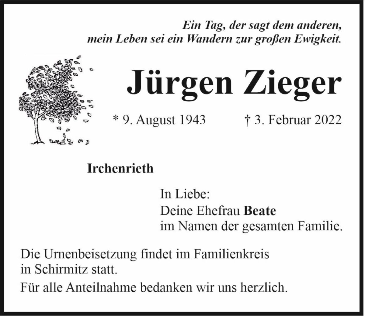 Traueranzeige Jürgen Zieger, Irchenrieth 08. Februar 2022, 06:00 Uhr Von: redaktion Traueranzeige Jürgen Zieger, Irchenrieth Landkreis Neustadt/WN Irchenrieth