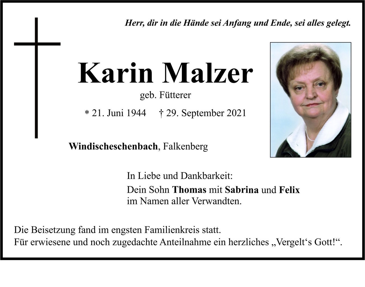 Traueranzeige Karin Malzer, Windischeschenbach 16. Oktober 2021, 04:00 Uhr Von: redaktion Traueranzeige Karin Malzer, Windischeschenbach Landkreis Tirschenreuth Falkenberg Landkreis Neustadt/WN Windischeschenbach