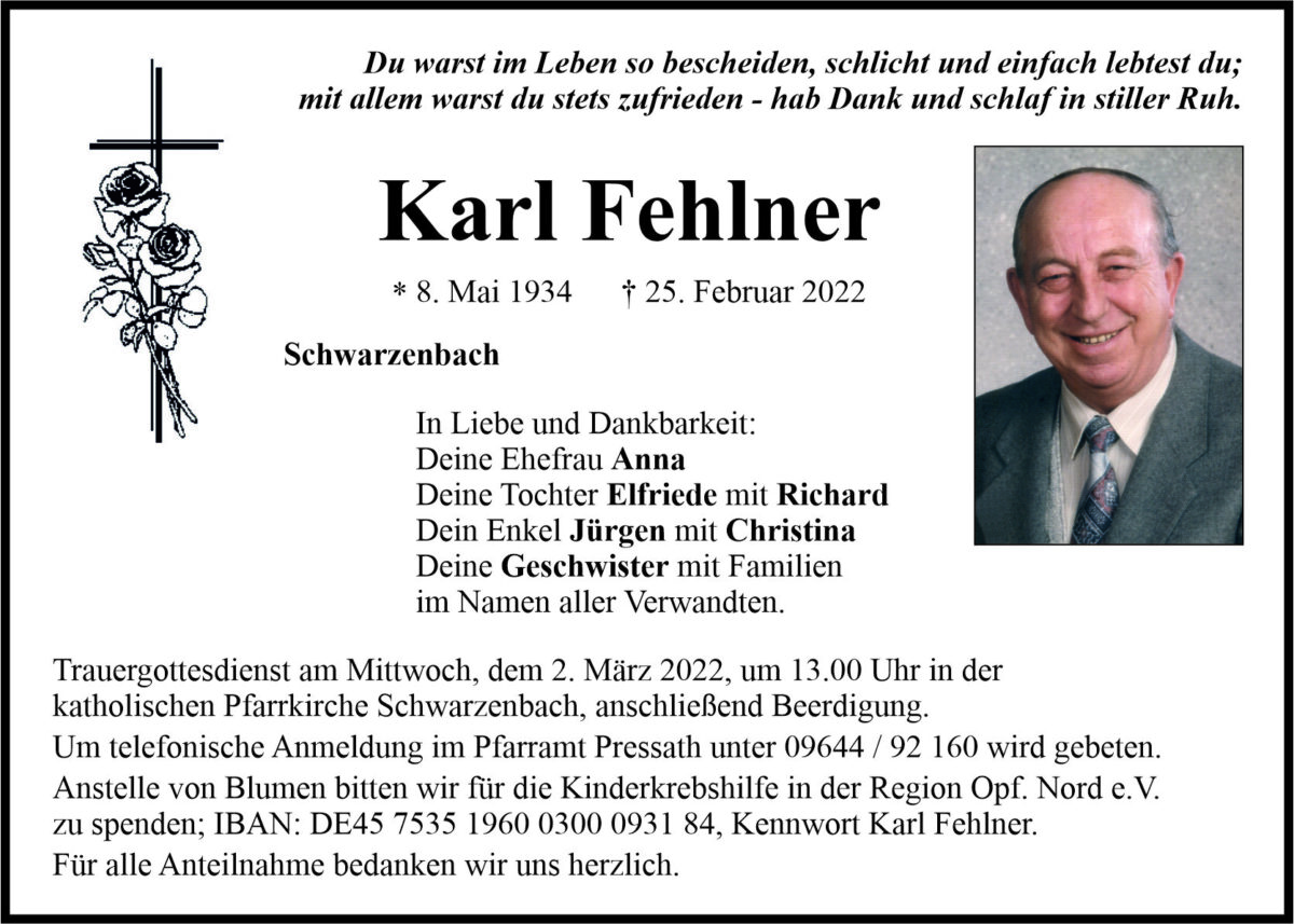 Traueranzeige Karl Fehlner, Schwarzenbach 01. März 2022, 06:00 Uhr Von: redaktion Traueranzeige Karl Fehlner, Schwarzenbach Landkreis Neustadt/WN Schwarzenbach