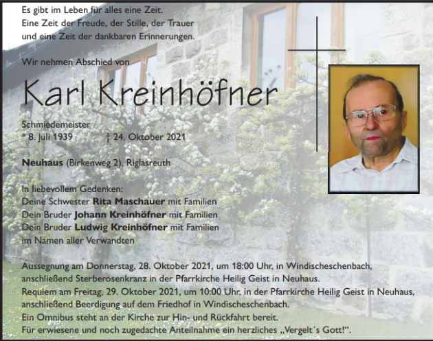 Traueranzeige Karl Kreinhöfner, Neuhaus 27. Oktober 2021, 04:00 Uhr Von: redaktion Traueranzeige Karl Kreinhöfner, Neuhaus Landkreis Neustadt/WN Neuhaus