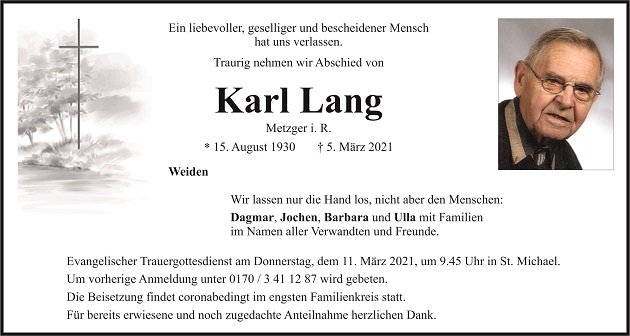 Traueranzeige Karl Lang, Weiden 08. März 2021, 06:13 Uhr Von: redaktion Traueranzeige Karl Lang, Weiden Stadtgebiete Weiden Weiden Stadt