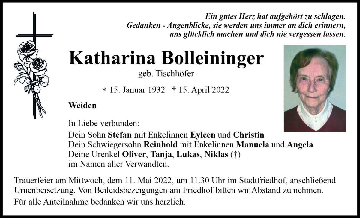 Traueranzeige Katharina Bolleininger, Weiden 07. Mai 2022, 06:00 Uhr Von: redaktion Traueranzeige Katharina Bolleininger, Weiden Stadtgebiete Weiden Weiden Stadt