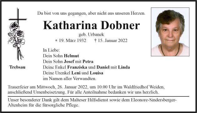 Traueranzeige Katharina Dobner, Trebsau 24. Januar 2022, 06:25 Uhr Von: redaktion Traueranzeige Katharina Dobner, Trebsau Landkreis Neustadt/WN Bechtsrieth