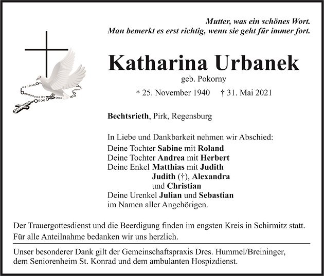 Traueranzeige Katharina Urbanek, Bechtsrieth 02. Juni 2021, 04:00 Uhr Von: redaktion Traueranzeige Katharina Urbanek, Bechtsrieth Landkreis Neustadt/WN Bechtsrieth Pirk