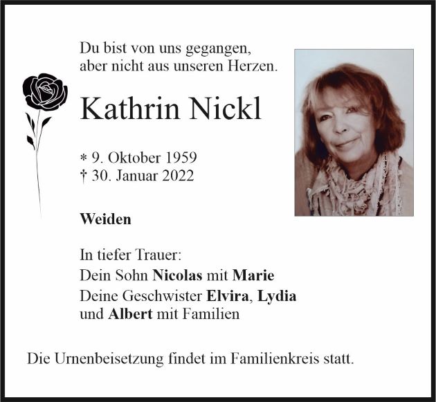 Traueranzeige Kathrin Nickl, Weiden 04. Februar 2022, 05:00 Uhr Von: redaktion Traueranzeige Kathrin Nickl, Weiden Stadtgebiete Weiden Weiden Stadt