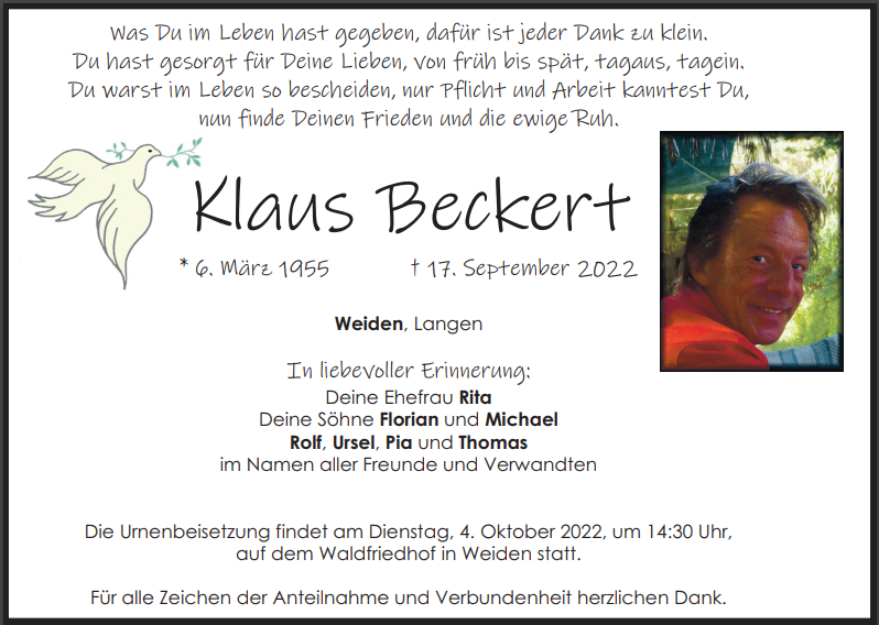 Traueranzeige Klaus Beckert, Weiden 28. September 2022, 06:00 Uhr Von: redaktion Traueranzeige Klaus Beckert, Weiden Stadtgebiete Weiden Weiden Stadt