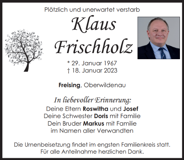 Traueranzeige Klaus Frischholz, Freising 25. Januar 2023, 06:00 Uhr Von: redaktion Traueranzeige Klaus Frischholz, Freising Landkreis Neustadt/WN Luhe-Wildenau