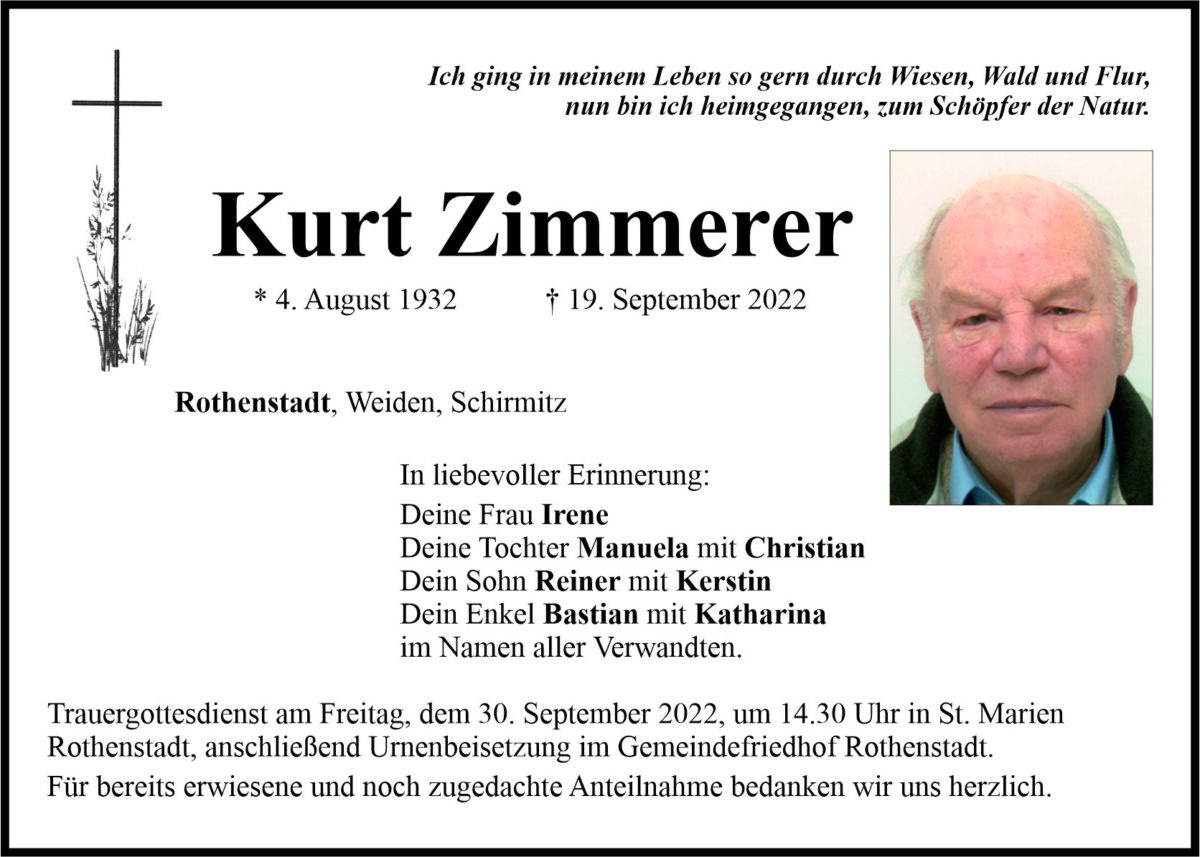 Traueranzeige Kurt Zimmerer, Rothenstadt 27. September 2022, 06:00 Uhr Von: redaktion Traueranzeige Kurt Zimmerer, Rothenstadt Stadtgebiete Weiden Rothenstadt Weiden Stadt Landkreis Neustadt/WN Schirmitz