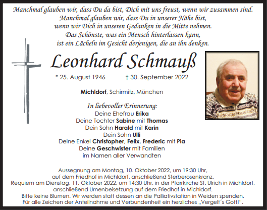 Traueranzeige Leonhard Schmauß, Michldorf 08. Oktober 2022, 06:00 Uhr Von: redaktion Traueranzeige Leonhard Schmauß, Michldorf Landkreis Neustadt/WN Leuchtenberg Schirmitz