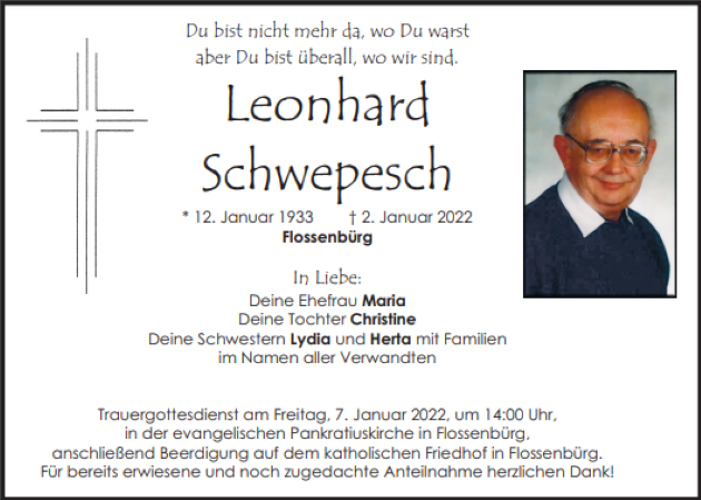 Traueranzeige Leonhard Schwepesch, Flossenbürg 04. Januar 2022, 05:00 Uhr Von: redaktion Traueranzeige Leonhard Schwepesch, Flossenbürg Landkreis Neustadt/WN Flossenbürg