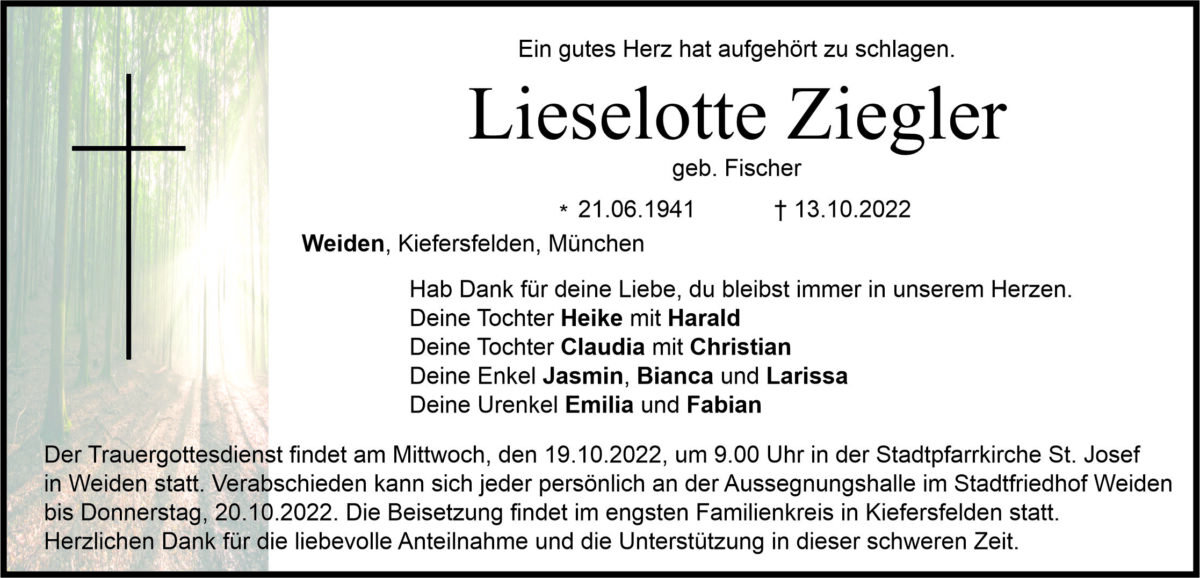 Traueranzeige Liselotte Ziegler, Weiden 17. Oktober 2022, 06:00 Uhr Von: redaktion Traueranzeige Liselotte Ziegler, Weiden Stadtgebiete Weiden Weiden Stadt