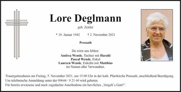Traueranzeige Lore Deglmann, Pressath 04. November 2021, 05:00 Uhr Von: redaktion Traueranzeige Lore Deglmann, Pressath Landkreis Neustadt/WN Pressath