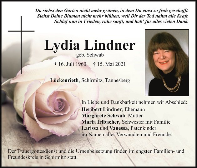 Traueranzeige Lydia Lindner, Lückenrieth 22. Mai 2021, 04:00 Uhr Von: redaktion Traueranzeige Lydia Lindner, Lückenrieth Landkreis Neustadt/WN Schirmitz Tännesberg