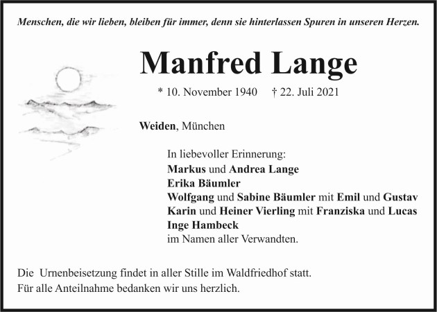 Traueranzeige Manfred Lange, Weiden 28. Juli 2021, 04:00 Uhr Von: redaktion Traueranzeige Manfred Lange, Weiden Stadtgebiete Weiden Weiden Stadt