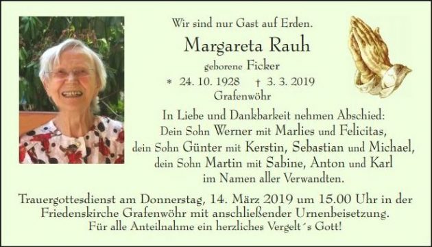 Traueranzeige Margareta Rauh, Grafenwöhr 11. März 2019, 07:19 Uhr Von: redaktion Traueranzeige Margareta Rauh, Grafenwöhr Landkreis Neustadt/WN Grafenwöhr
