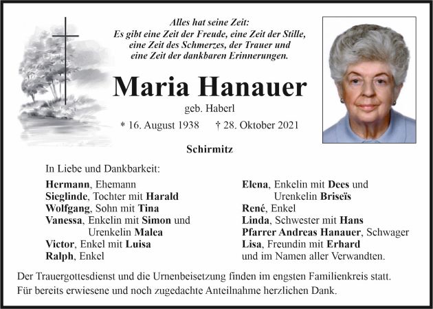 Traueranzeige Maria Hanauer, Schirmitz 10. November 2021, 05:00 Uhr Von: redaktion Traueranzeige Maria Hanauer, Schirmitz Landkreis Neustadt/WN Schirmitz