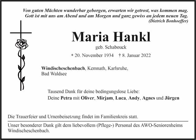 Traueranzeige Maria Hankl, Windischeschenbach 19. Januar 2022, 06:15 Uhr Von: redaktion Traueranzeige Maria Hankl, Windischeschenbach Landkreis Tirschenreuth Kemnath Landkreis Neustadt/WN Windischeschenbach