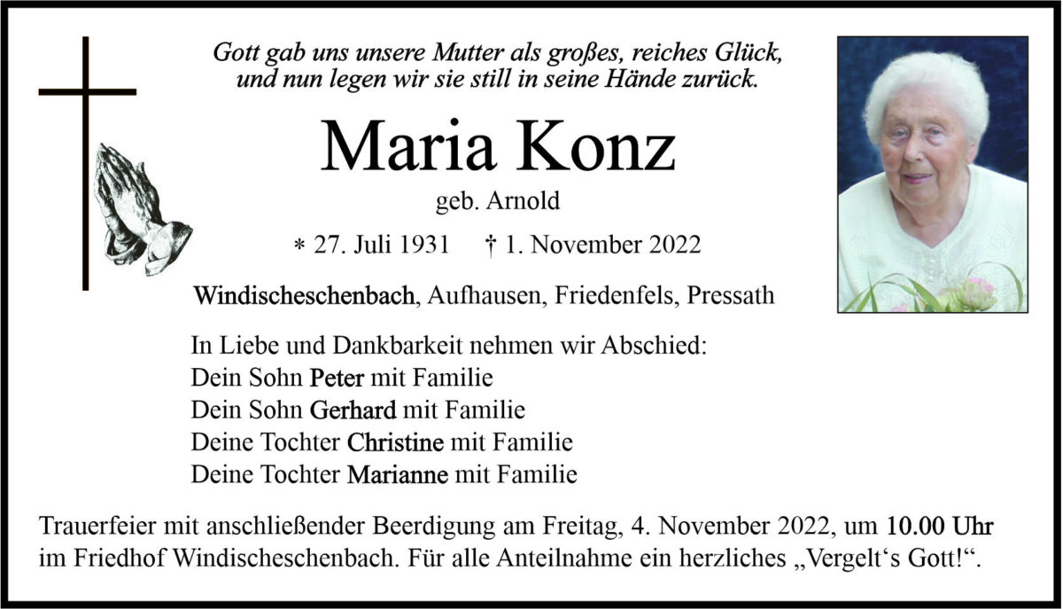 Traueranzeige Maria Konz, Windischeschenbach 03. November 2022, 06:00 Uhr Von: redaktion Traueranzeige Maria Konz, Windischeschenbach Landkreis Tirschenreuth Friedenfels Landkreis Neustadt/WN Pressath Windischeschenbach