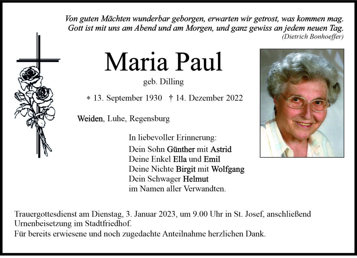 Traueranzeige Maria Paul, Weiden 28. Dezember 2022, 06:00 Uhr Von: redaktion Traueranzeige Maria Paul, Weiden Landkreis Neustadt/WN Luhe-Wildenau Regensburg Stadtgebiete Weiden Weiden Stadt