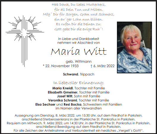 Traueranzeige Maria Witt, Schwand 08. März 2022, 06:00 Uhr Von: redaktion Traueranzeige Maria Witt, Schwand Landkreis Neustadt/WN Parkstein Weiherhammer