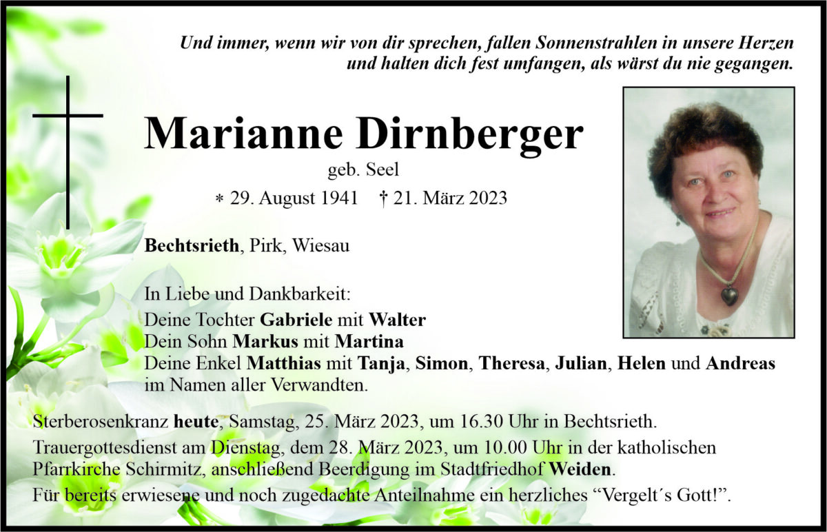 Traueranzeige Marianne Dirnberger, Bechtsrieth 24. März 2023, 20:00 Uhr Von: redaktion Traueranzeige Marianne Dirnberger, Bechtsrieth Landkreis Neustadt/WN Bechtsrieth Pirk Landkreis Tirschenreuth Wiesau