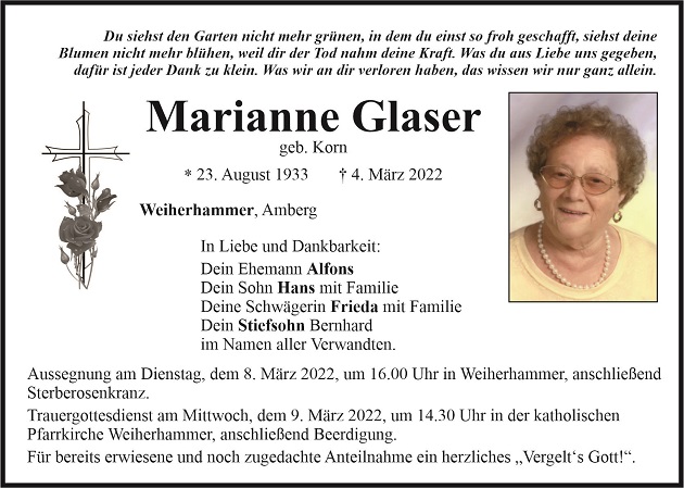 Traueranzeige Marianne Glaser, Weiherhammer 07. März 2022, 07:00 Uhr Von: redaktion Traueranzeige Marianne Glaser, Weiherhammer Landkreis Neustadt/WN Weiherhammer