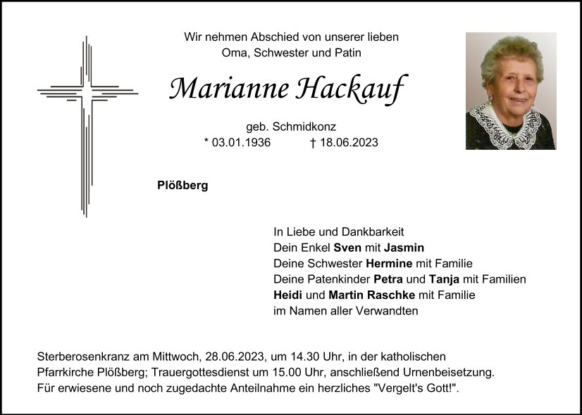 Traueranzeige Marianne Hackauf, Plößberg 25. Juni 2023, 20:00 Uhr Von: redaktion Traueranzeige Marianne Hackauf, Plößberg Landkreis Tirschenreuth Plößberg