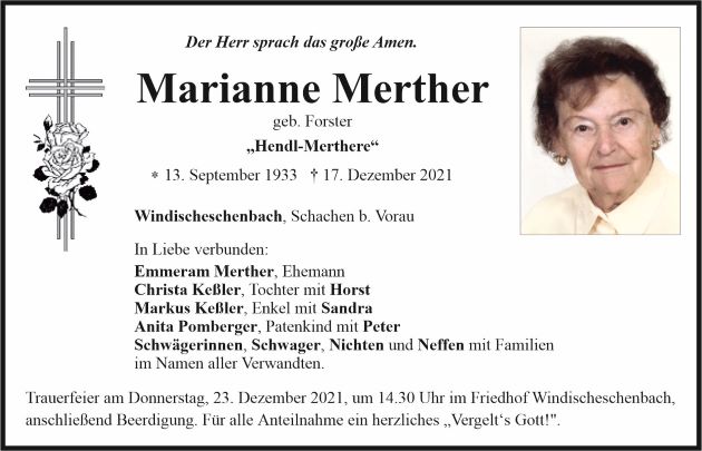 Traueranzeige Marianne Merther, Windischeschenbach 21. Dezember 2021, 05:00 Uhr Von: redaktion Traueranzeige Marianne Merther, Windischeschenbach Landkreis Neustadt/WN Windischeschenbach