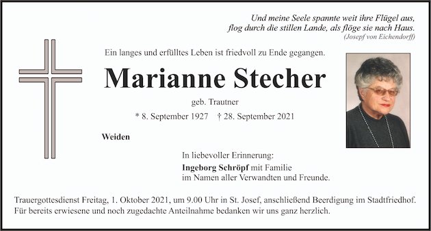 Traueranzeige Marianne Stecher, Weiden 30. September 2021, 04:00 Uhr Von: redaktion Traueranzeige Marianne Stecher, Weiden Stadtgebiete Weiden Weiden Stadt