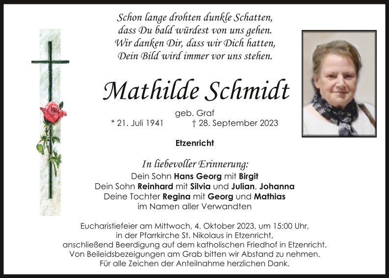 Traueranzeige Mathilde Schmidt, Etzenricht 29. September 2023, 20:00 Uhr Von: redaktion Traueranzeige Mathilde Schmidt, Etzenricht Landkreis Neustadt/WN Etzenricht