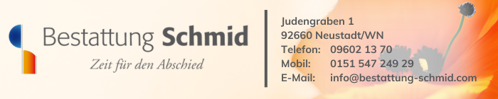 Traueranzeige Max Wagmüller, Neustadt/WN 29. Juni 2025, 17:12 Uhr Von: redaktion Begleitet durch: Bestattung Schmid - Neustadt/WN Begleitet durch: Bestattung Schmid - Neustadt/WN Traueranzeige Max Wagmüller, Neustadt/WN Landkreis Neustadt/WN Neustadt/WN