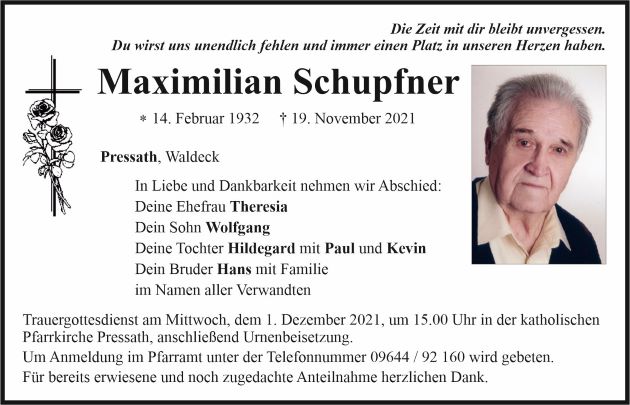 Traueranzeige Maximilian Schupfner, Pressath 29. November 2021, 05:00 Uhr Von: redaktion Traueranzeige Maximilian Schupfner, Pressath Landkreis Neustadt/WN Pressath
