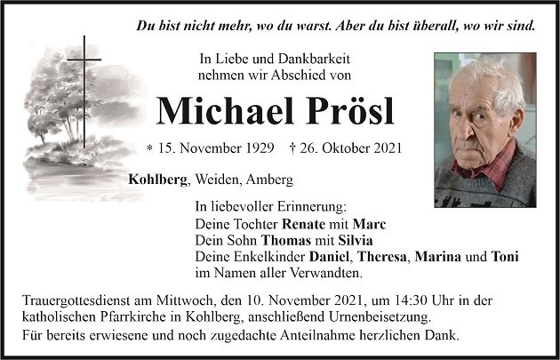 Traueranzeige Michael Prösl, Kohlberg 30. Oktober 2021, 04:00 Uhr Von: redaktion Traueranzeige Michael Prösl, Kohlberg Stadtgebiete Amberg Amberg Stadt Landkreis Neustadt/WN Kohlberg Stadtgebiete Weiden Weiden Stadt