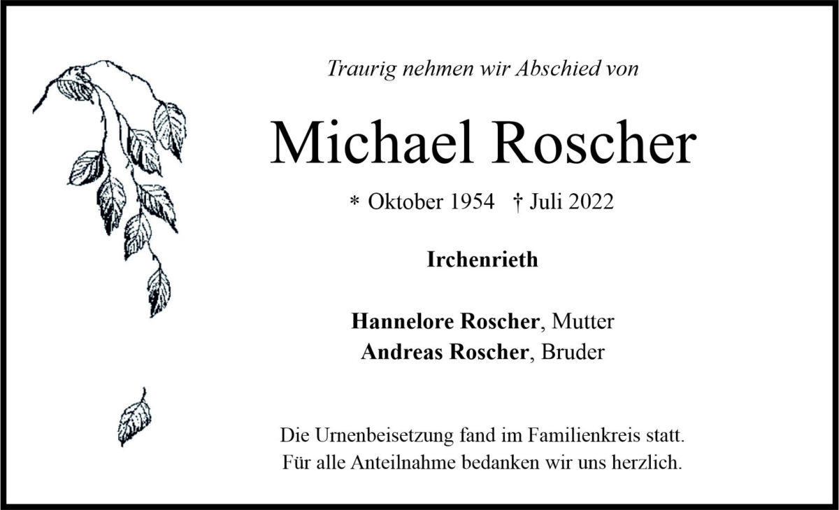 Traueranzeige Michael Roscher, Irchenrieth 20. Juli 2022, 06:00 Uhr Von: redaktion Traueranzeige Michael Roscher, Irchenrieth Landkreis Neustadt/WN Irchenrieth