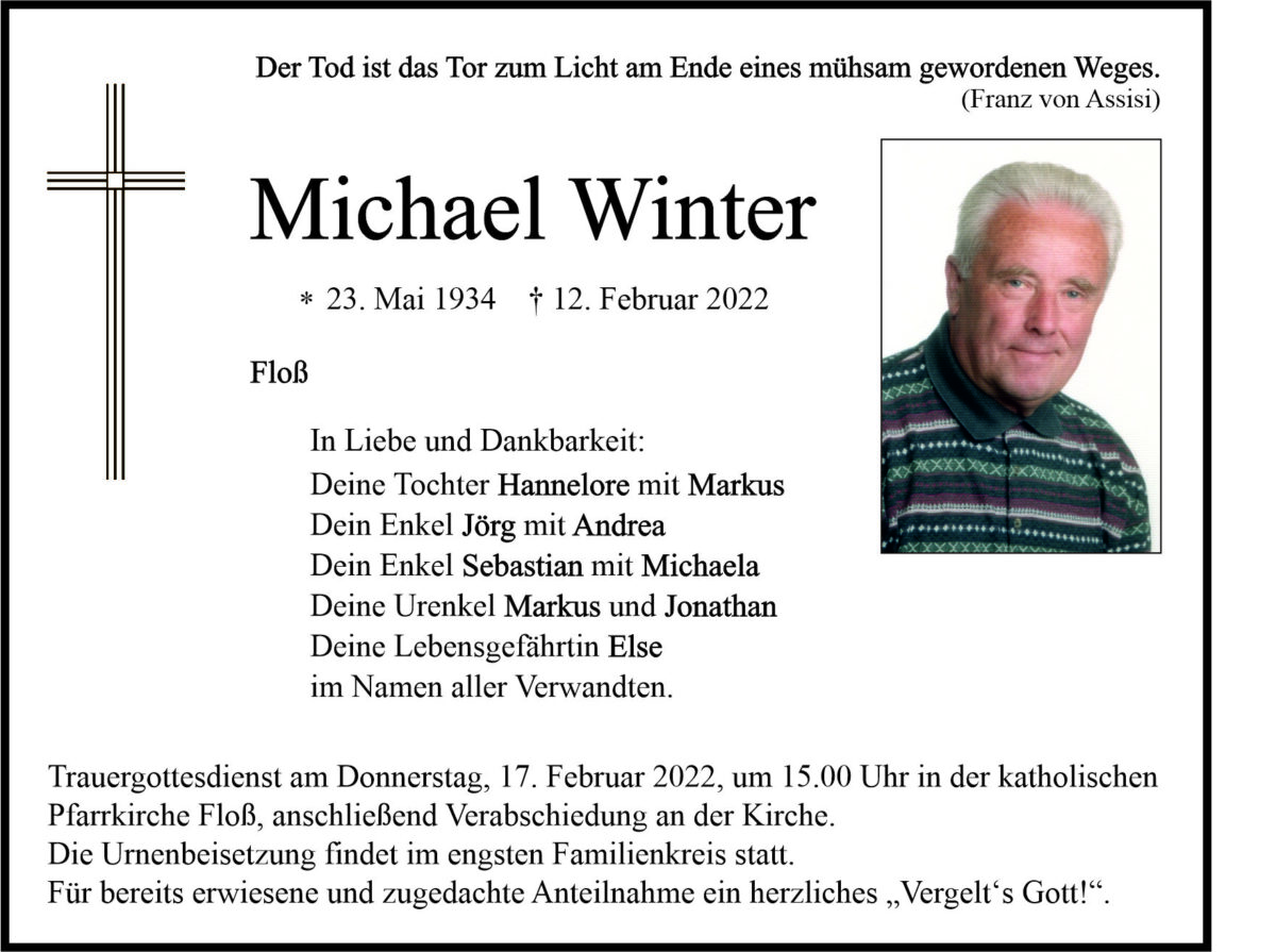 Traueranzeige Michael Winter, Floß 15. Februar 2022, 06:00 Uhr Von: redaktion Traueranzeige Michael Winter, Floß Landkreis Neustadt/WN Floß