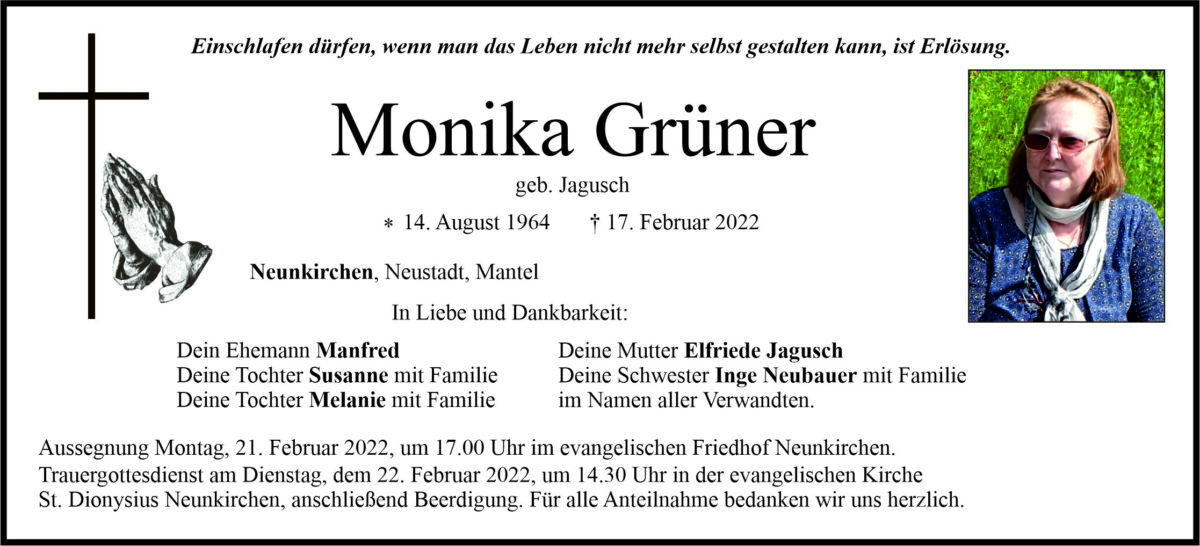 Traueranzeige Monika Grüner, Neunkirchen 19. Februar 2022, 06:00 Uhr Von: redaktion Traueranzeige Monika Grüner, Neunkirchen Landkreis Neustadt/WN Mantel Neustadt/WN Stadtgebiete Weiden Neunkirchen
