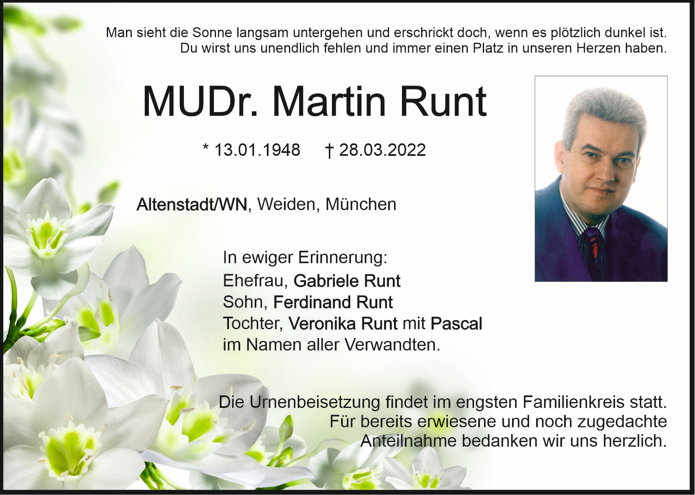 Traueranzeige MUDr. Martin Runt, Altenstadt/WN 05. April 2022, 06:00 Uhr Von: redaktion Traueranzeige MUDr. Martin Runt, Altenstadt/WN Landkreis Neustadt/WN Altenstadt/WN Stadtgebiete Weiden Weiden Stadt