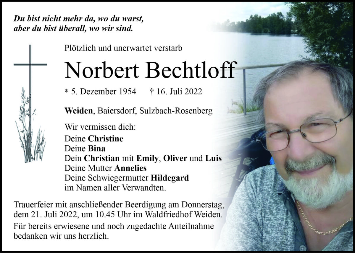 Traueranzeige Norbert Bechtloff, Weiden 19. Juli 2022, 06:00 Uhr Von: redaktion Traueranzeige Norbert Bechtloff, Weiden Stadtgebiete Weiden Weiden Stadt