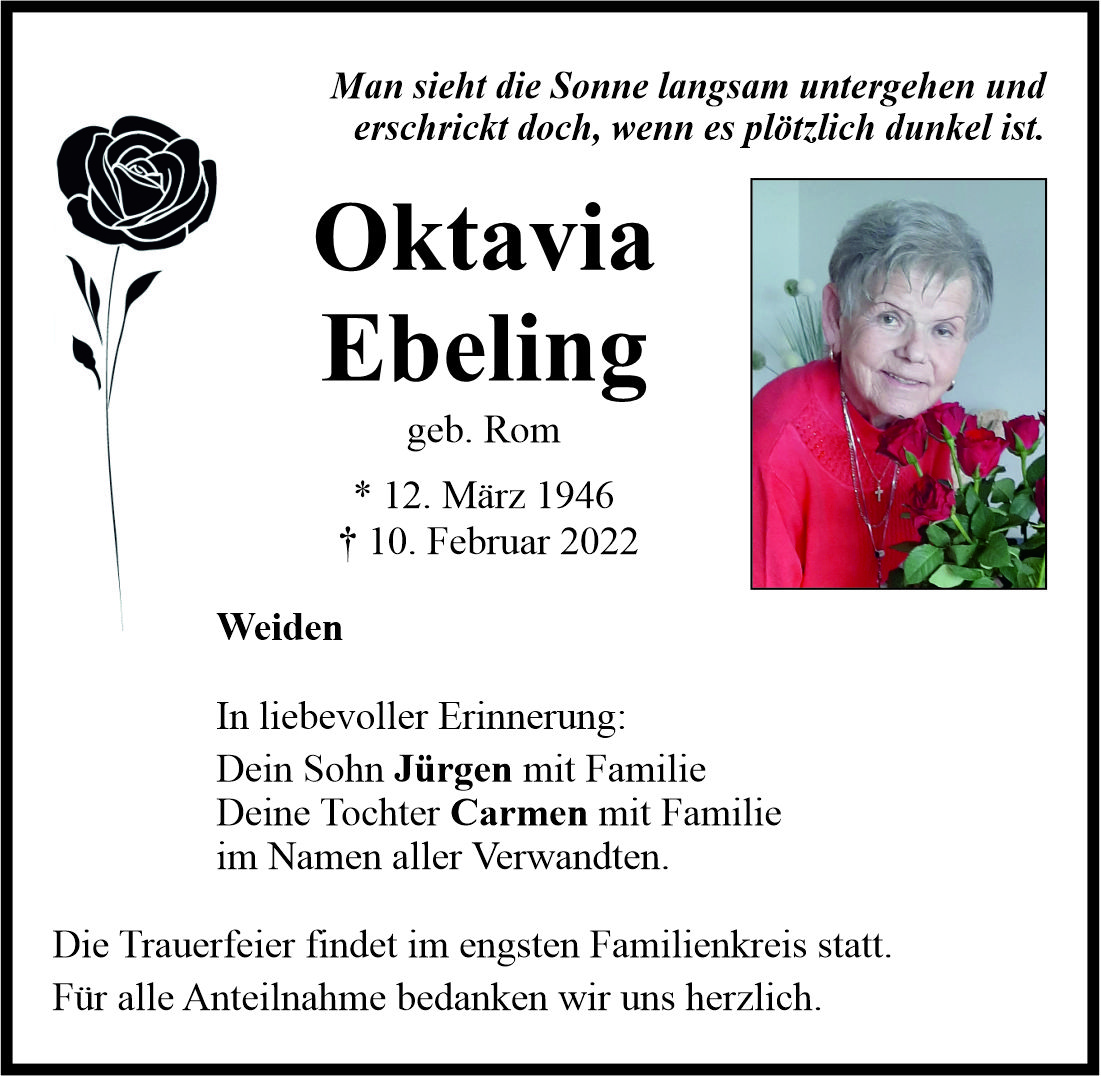 Traueranzeige Oktavia Ebeling, Weiden 16. Februar 2022, 06:00 Uhr Von: redaktion Traueranzeige Oktavia Ebeling, Weiden Stadtgebiete Weiden Weiden Stadt