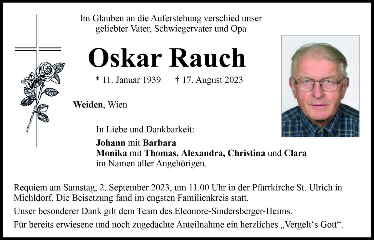 Traueranzeige Oskar Rauch, Weiden 29. August 2023, 20:00 Uhr Von: redaktion Traueranzeige Oskar Rauch, Weiden Stadtgebiete Weiden Weiden Stadt