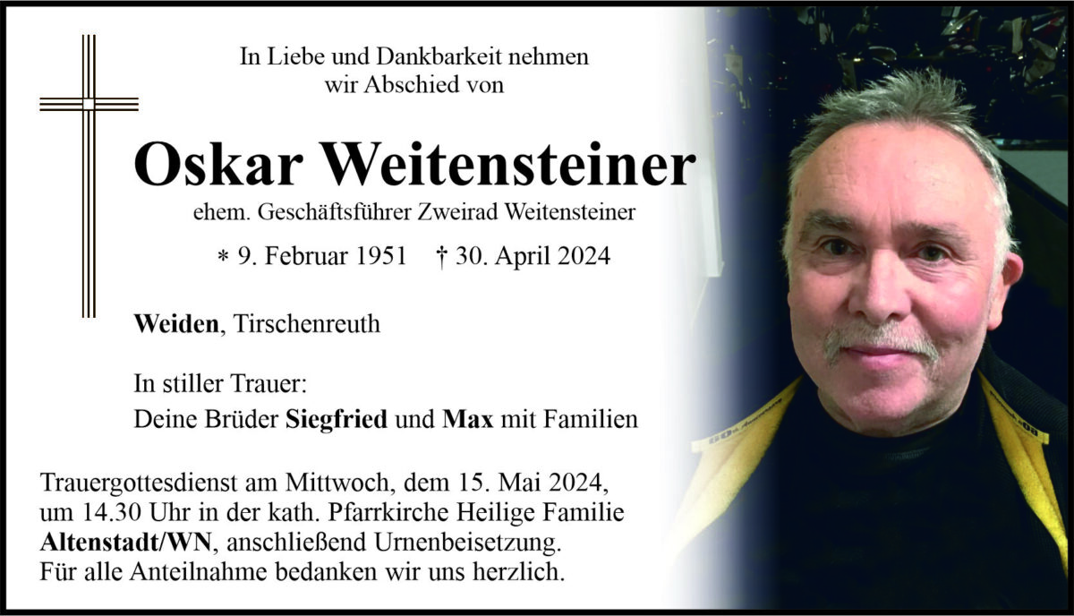 Traueranzeige Oskar Weitensteiner, Weiden 10. Mai 2024, 20:00 Uhr Von: redaktion Begleitet durch: Bestattung Bauer - Weiden Traueranzeige Oskar Weitensteiner, Weiden Landkreis Tirschenreuth Tirschenreuth Stadtgebiete Weiden Weiden Stadt