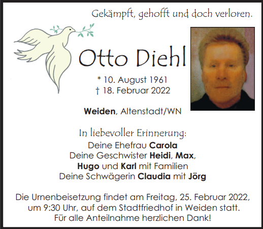 Traueranzeige Otto Diehl, Weiden 23. Februar 2022, 06:00 Uhr Von: redaktion Traueranzeige Otto Diehl, Weiden Landkreis Neustadt/WN Altenstadt/WN Stadtgebiete Weiden Weiden Stadt