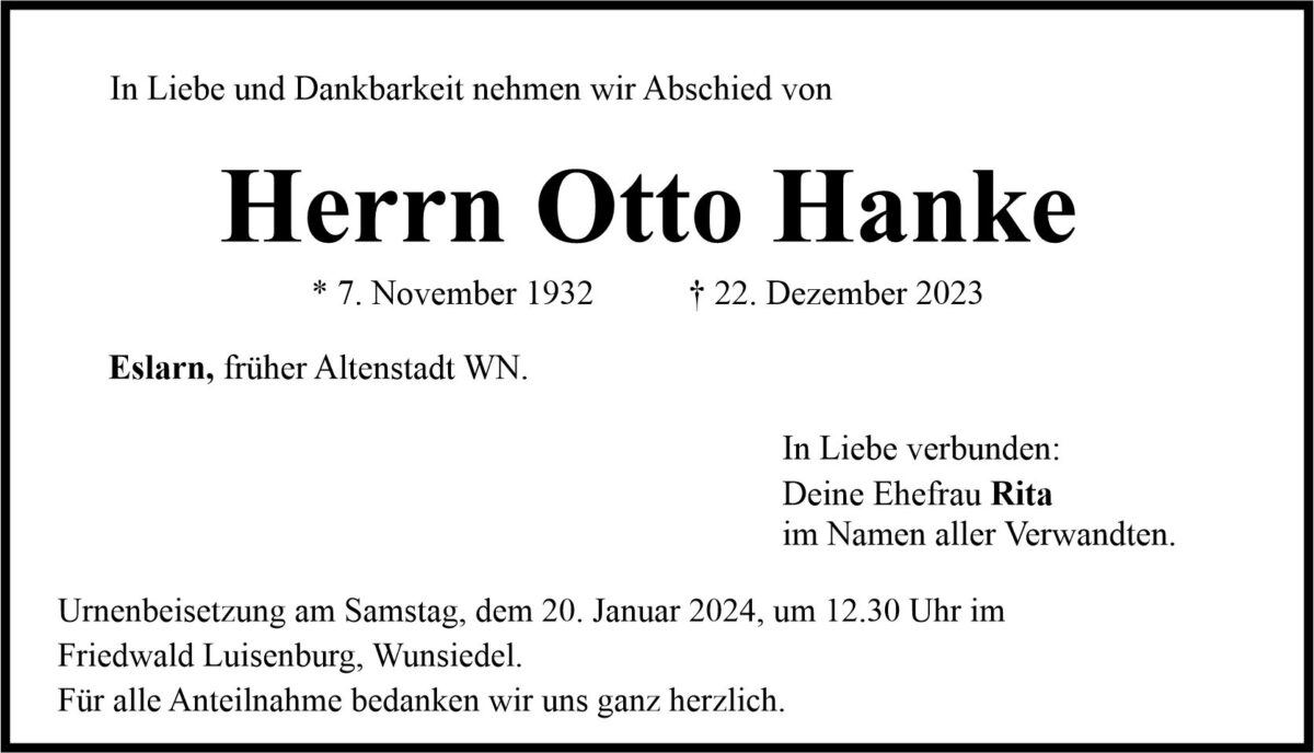 Traueranzeige Otto Hanke, Eslarn 16. Januar 2024, 20:00 Uhr Von: redaktion Traueranzeige Otto Hanke, Eslarn Landkreis Neustadt/WN Altenstadt/WN Eslarn