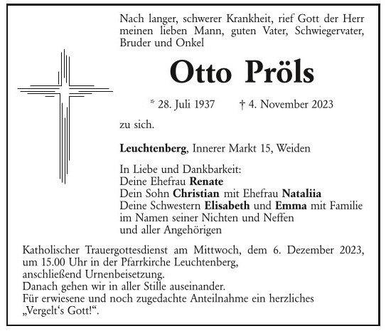 Traueranzeige Otto Pröls, Leuchtenberg 01. Dezember 2023, 20:00 Uhr Von: redaktion Traueranzeige Otto Pröls, Leuchtenberg Landkreis Neustadt/WN Leuchtenberg Stadtgebiete Weiden Weiden Stadt